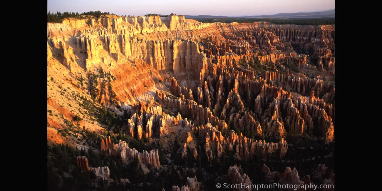 From Bryce Point, one of the most scenic vistas of the full amphitheater and all its wonders amaze the visitor. Bryce Point is famous for its extraordinary sunrises. From here you can watch the tops of hoodoos set alight as if by fire from the first rays of the rising sun. Like fire, the orange light quickly spreads driving shadows from all but the deepest recesses of the amphitheater.