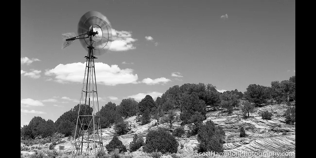 This is one of the very few photos I have posted on my website that was originally shot with black and white film. I also shot this using a digital color camera but when I converted it to black and white, I lost the texture on the rocky hill. This is because film has a lot less latitude and therefore the shadowy areas are more “pronounced.” In this case the shadows showcase the many layers of sandstone that created this hill.
