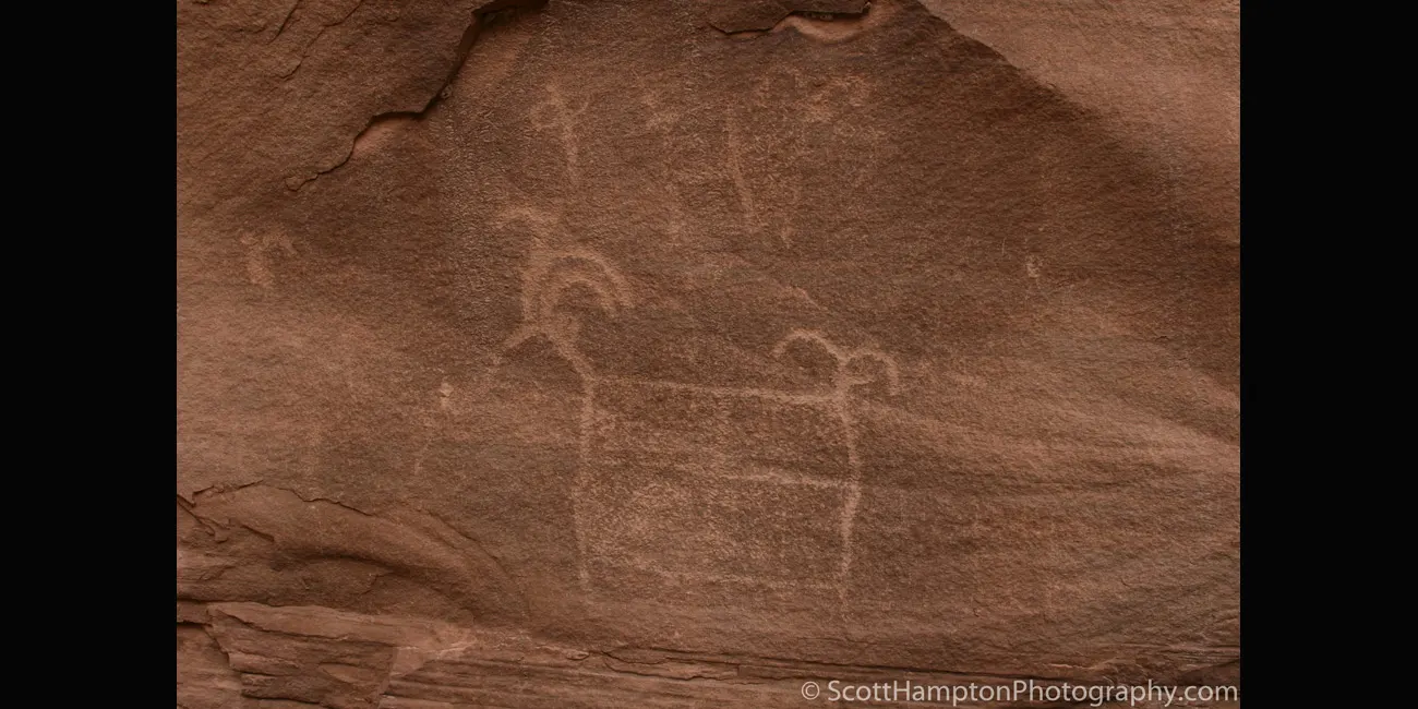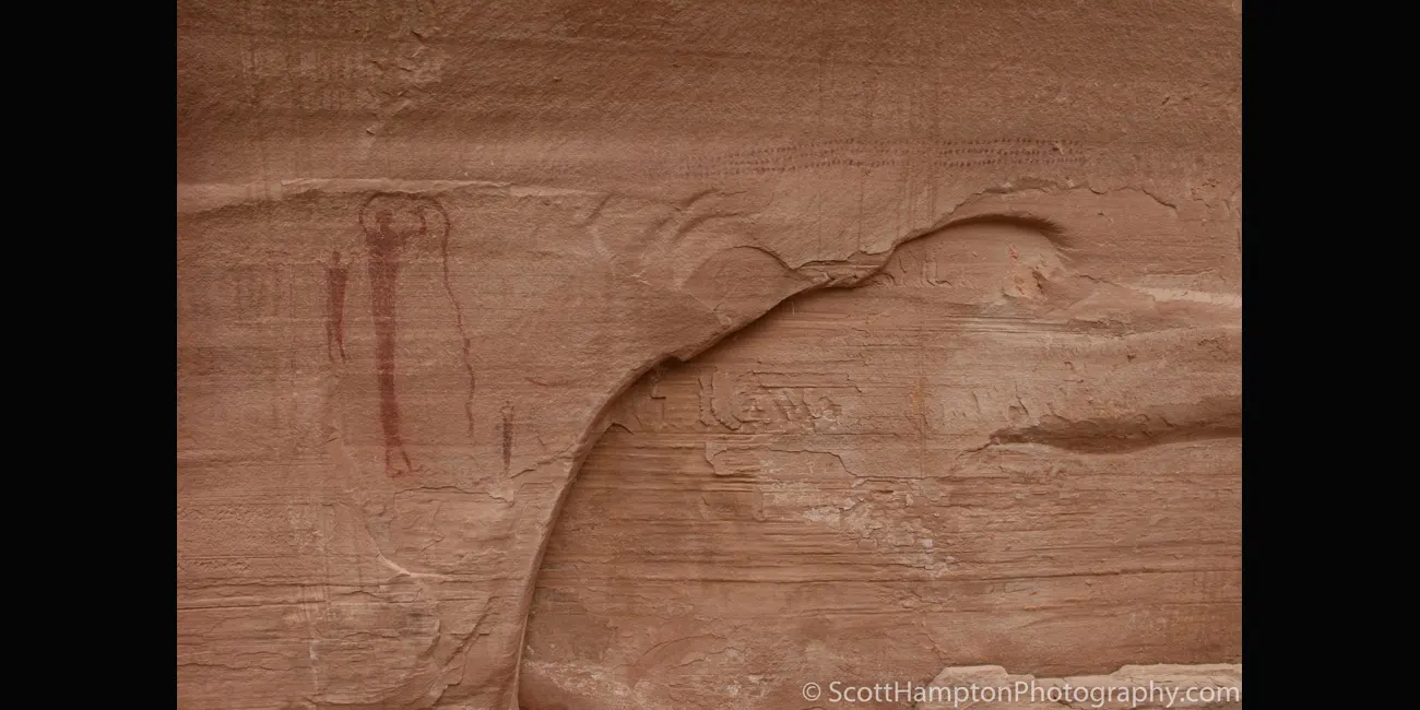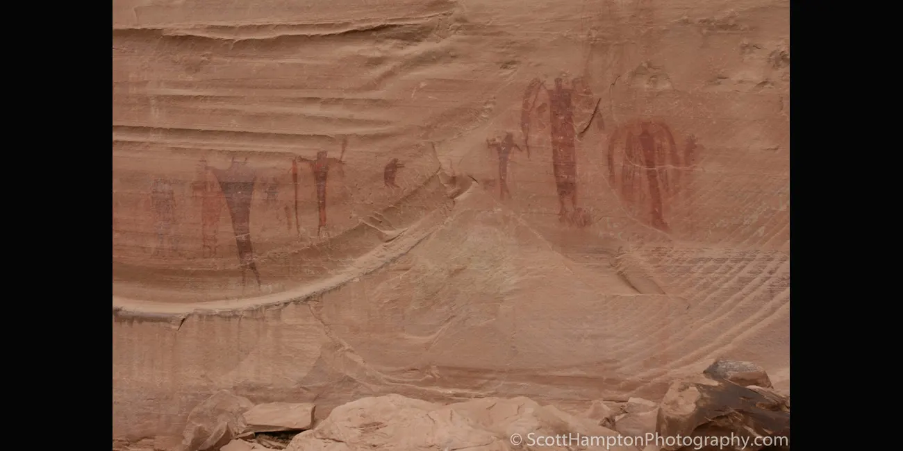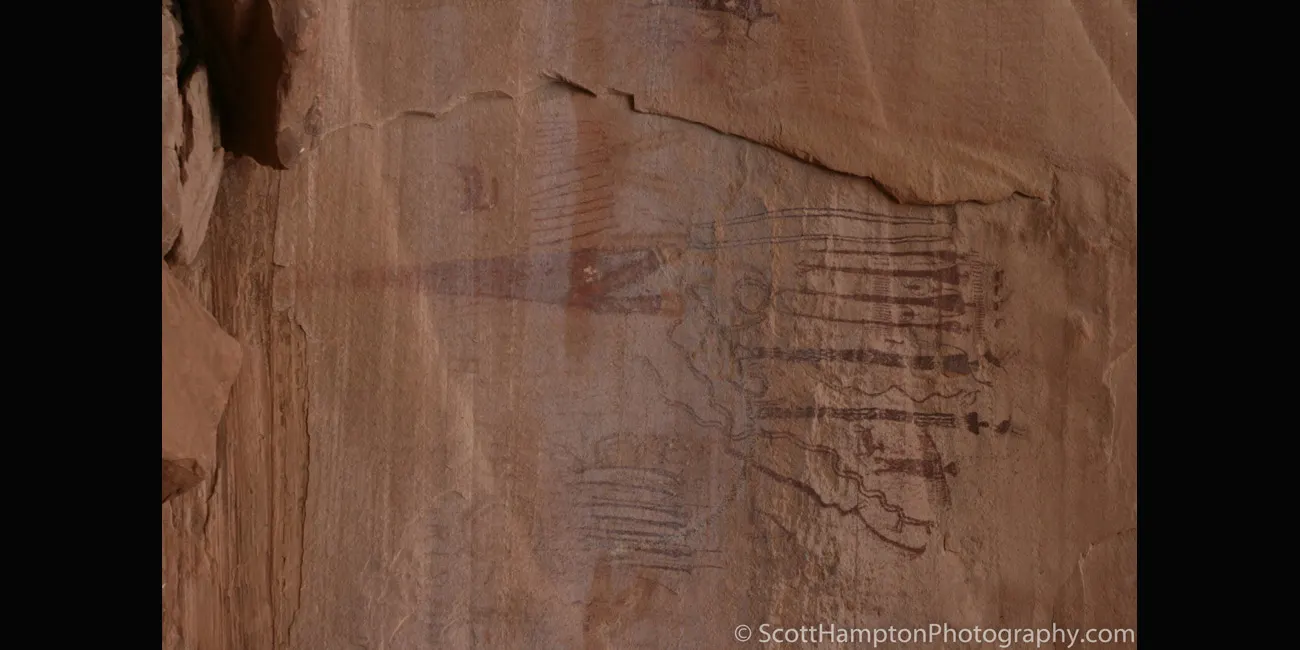 Primarily a Barrier Canyon Style panel, there are a few later petroglyphs of Fremont culture origin as well. In many cases the Fremont painted figures on top of the older Barrier Canyon ones.